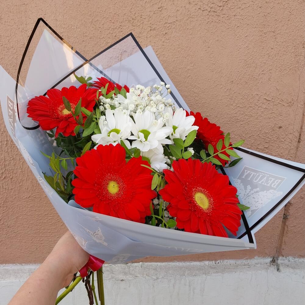 Гипсофила - 1 шт.Гербера - 5 шт.Фисташка - 10 шт.Упаковка дизайнерская - 3 шт.бакарди ромашка хризантема кустовая - 1 шт.